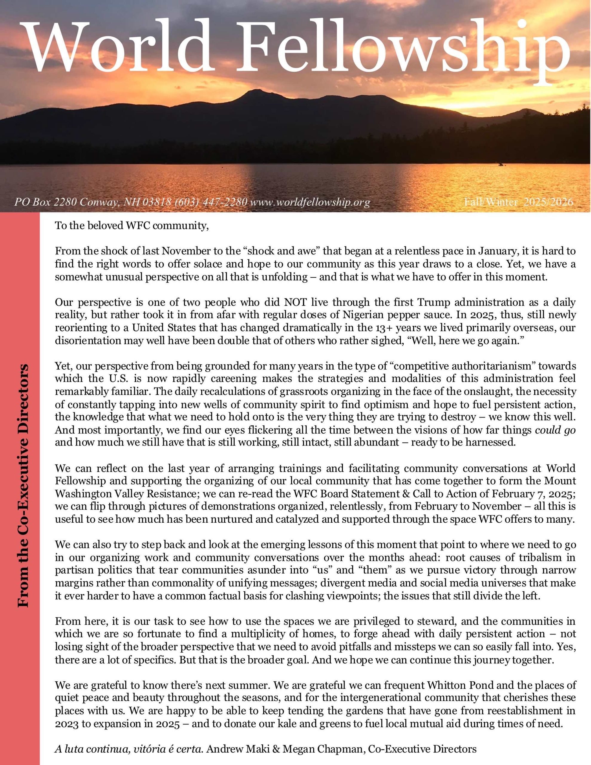 For over 80 years, World Fellowship Center has nurtured a progressive vision for a more peaceful, just and equitable world. World Fellowship welcomes all who seek community, solidarity and respite in the beautiful White Mountains of New Hampshire on the Abenaki land of N'Dakinna.