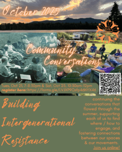 As we move into the fall, we welcome retreat groups and continue to foster and support resistance and learning in our local community, including a montj-long teach-in/film screening series to lay the foundation for collective action around Gaza. We will also continue our community conversations on growing intergenerational resistance online to support our extended community with two virtual conversations in October. In community, in solidarity, in resistance!