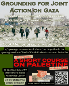 Join us at 6pm at the Cook Memorial Library in Tamworth for the launch of our October film series focused on deepening our understanding of the struggle for Palestinian freedom and an end to the mass atrocities ongoing in Gaza. At this launch session, we will have a 30-minute introductory conversation, and then participate in the first session of the “Short Course on Palestine” with Rashid Khalidi, which we encourage those joining the film series to also participate in.