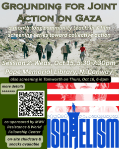 Starting in October, we will be screening and discussing one film weekly in both Tamworth and North Conway. Films will include No Other Land, Israelism, and The Encampments. At the end of the series, we will be gathering across towns to discuss local strategies that can make a difference at this critical moment. Organized by the Mount Washington Valley Resistance and the World Fellowship Center.