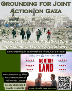 Starting in October, we will be screening and discussing one film weekly in both Tamworth and North Conway. Films will include No Other Land, Israelism, and The Encampments. At the end of the series, we will be gathering across towns to discuss local strategies that can make a difference at this critical moment. Organized by the Mount Washington Valley Resistance and the World Fellowship Center.