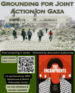 Through the month of October, we have screened weekly films in both Tamworth and North Conway. These have included No Other Land, Israelism, The Occupation of the American Mind, and Boycott. We end the series this week with The Encampments to kick off a conversation about the crackdown on campus activism and freedom of speech, and the generational and other divides that have emerged within the political left during this era.